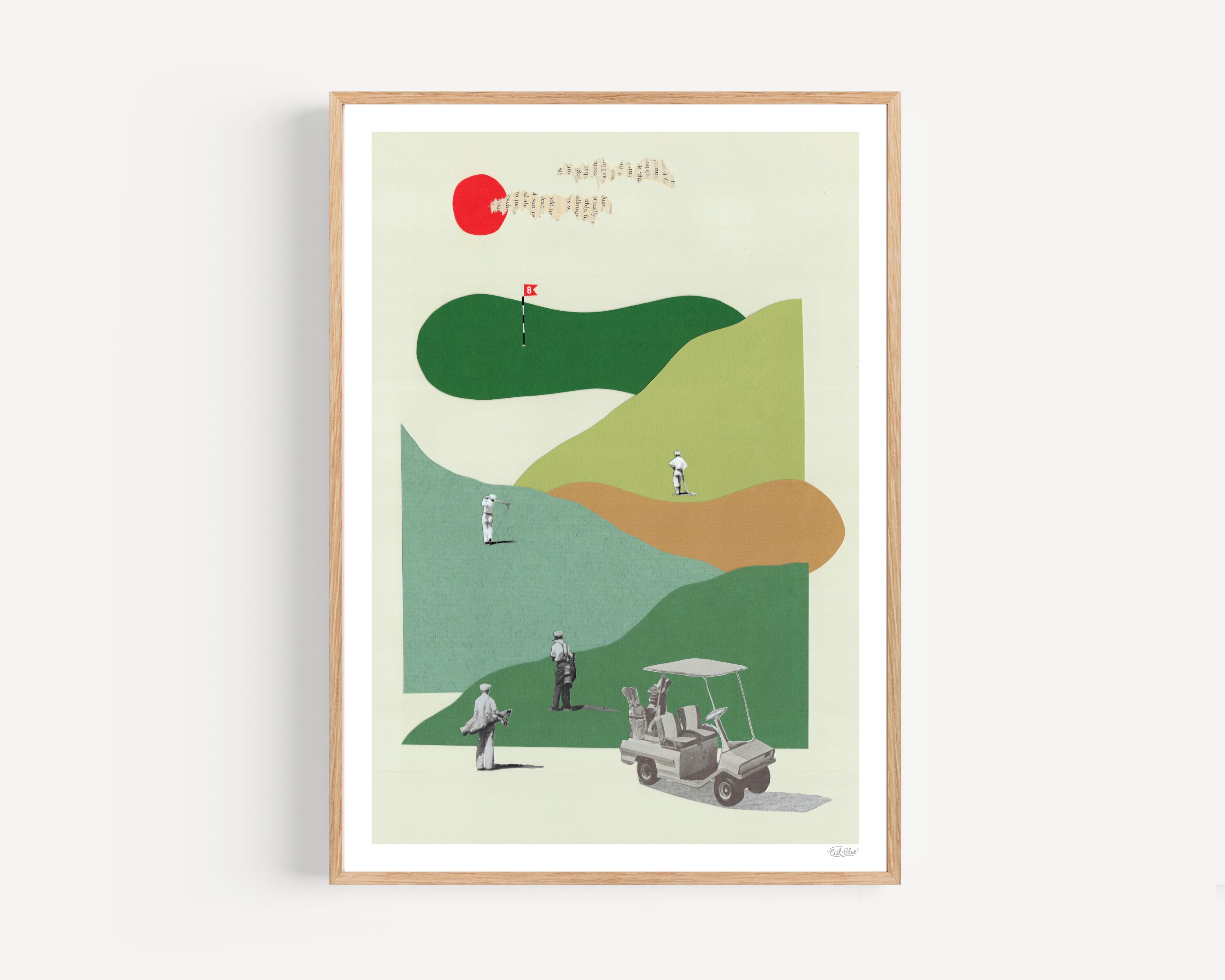 ティーグラウンドからグリーンまでの景色を、コラージュ技法で層状に重ねて表現。起伏する丘、バンカー、フェアウェイ、ラフが、まるで地層のように積み重なり、ゴルフコースの豊かな表情を描き出します。