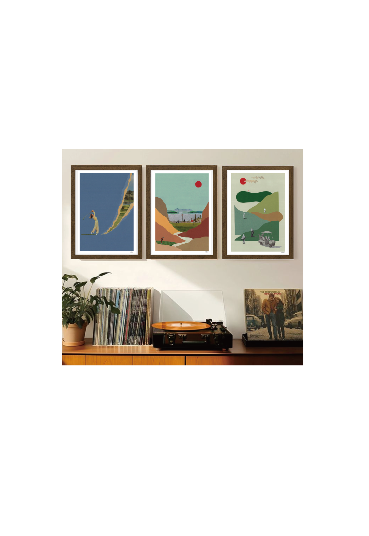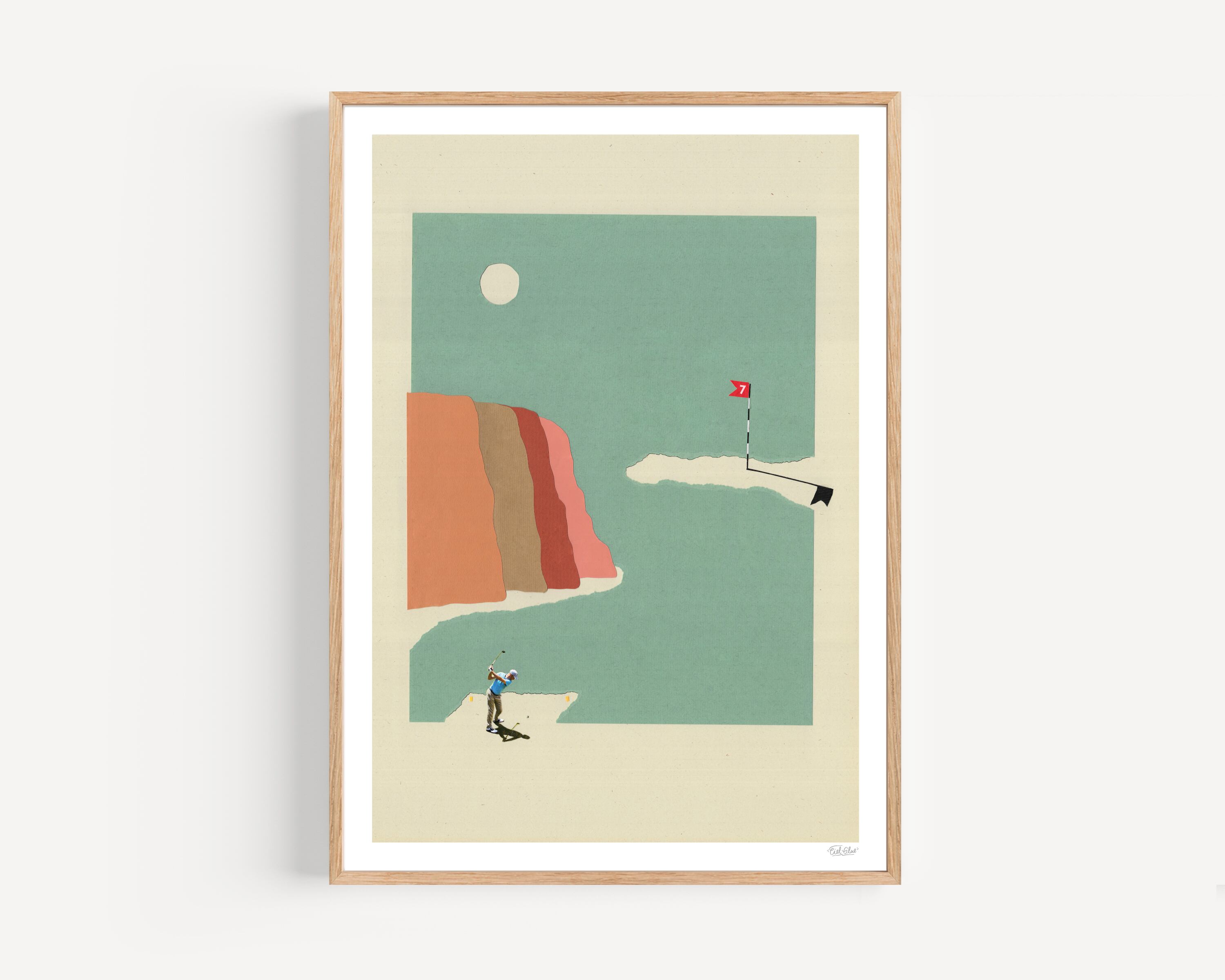 「Nuked」は、ヴィンテージ調のゴルフアートプリントで、完璧なスイングに全身全霊を注ぐゴルファーの集中力と精密さを捉えています。