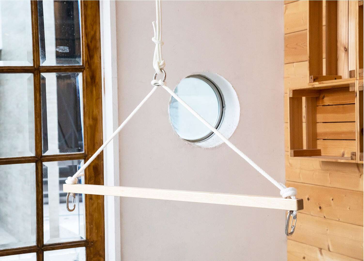 両サイドのカラビナにチェア型ハンモックを掛け、一点吊りでハンモックをお楽しみいただけます。